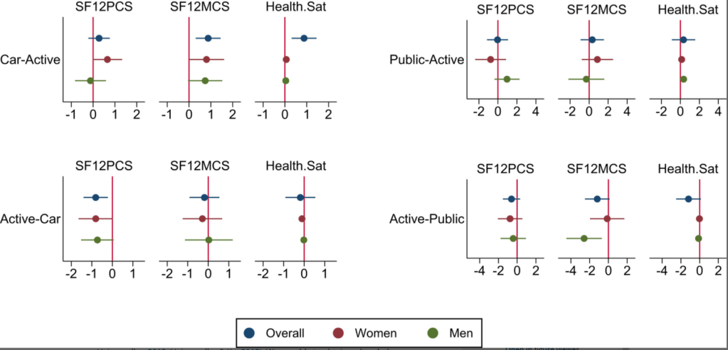 “……results indicate a significant increase in physical and mental health for commuters switching from car to active forms of transport, particularly for women. We further observe a decline in physical health for individuals of both sexes who switch from active travel to car.”